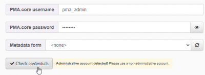 If you happen to want to use a PMA.core account that has the administrative flag set to True, you'll get a warning. It's not a requirement as such that you use a non-administrative account, but it is strongly recommended that you don't.