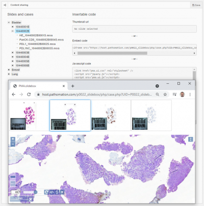 You can both embed cases and individual slides. For cases, the thumbnail URL is now shown. But when you link to a case via our default case.php script, you will be presented with a (PMA.UI) thumbnail gallery to select your slide from.