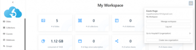 In My.Pathomation you can work on your personal workspace (my workspace) or jump into an Organization. Through the profile management interface, accessed by clicking the button with the Initials of your name in the right upper corner of the interface, it is possible to create new organizations, and move between your personal profile and existing organizations. You have a free 1 month test period after creating an organization after which you have the option to switch to a paid subscription.