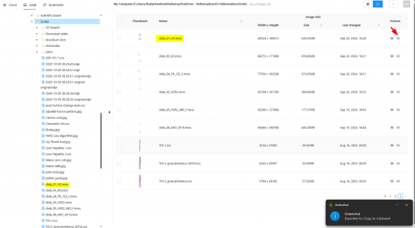 My Pathomation also works as a viewer for local images. When it comes to complex whole slide image types, looking through the eyes of the local viewer you always see one image, the software groups all subfolders and data files also for uploading, avoiding you to go and copy each relevant file contributing to complex whole slide image types.