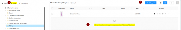 This will allow you to drag and drop images from your local folders.(1). Simply drag your file or files from your local storage hold it over the dropzone and release it for upload. Have a look at this video with an example from Grundium slide scanners.