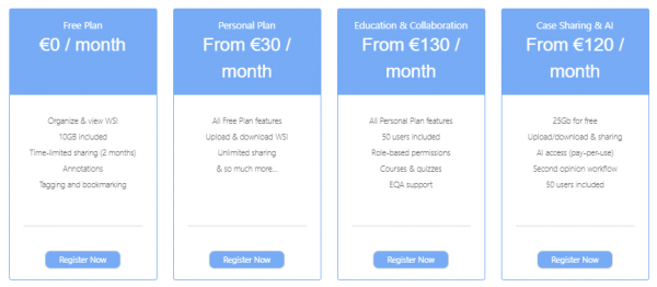 My Pathomation offers a free plan to explore the functionality with a 10GB image storage. For storing larger volumes of images, a monthly, volume-based subscription fee is required starting at 30 EUR for 25GB storage. You can create organisations with up to 50 members by adding an additional monthly fee. Users can increase and decrease their required storage volume as required per organisation or personal workspace. There is no upper limit for the storage volume. Contact us at info@pathomation.com for a personalised proposal