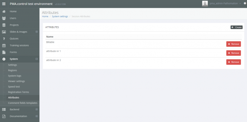 In the Attributes page of the System section of the administrators sidebar, you can view existing attributes that can be applied to a Training Session and quickly create new ones.