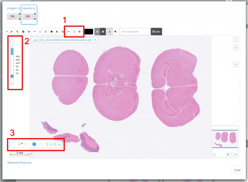 To demonstrate, lets use these tools to flip the image from left to right, and zoom in on the small tissue sample at the bottom of the image.