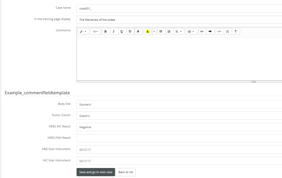 If you would like to add meaningful metadata to your cases during training sessions, PathoTrainer allows you to do this quickly using your own comment field templates. As a pathologist, you can structure this information exactly the way you prefer—whether it’s key histological features, clinical context, or teaching points you want to highlight.