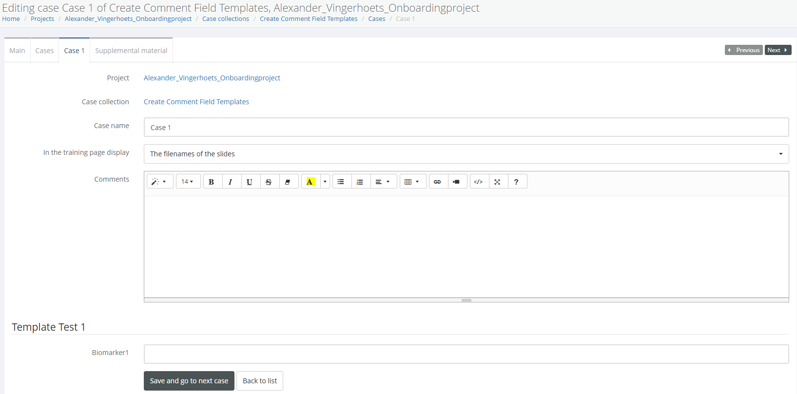 If you would like to add meaningful metadata to your cases during training sessions, PathoTrainer allows you to do this quickly using your own comment field templates. As a pathologist, you can structure this information exactly the way you prefer—whether it’s key histological features, clinical context, or teaching points you want to highlight.