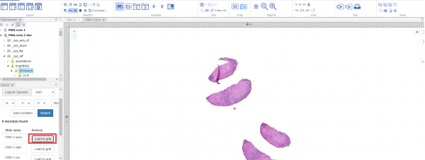 Once you have selected search conditions and then press “Search” button list of results would show up if any. The results consists of “Folder”, “Slide name” and action button “Load to grid” that loads the selected search record slide to the viewport.