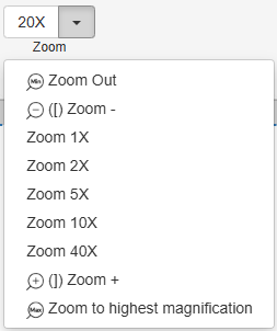 Zoom dropdown consists of different zoom sizes for the viewport, with 20X zoom as default size. User can click on the dropdown arrow to access other zoom options.