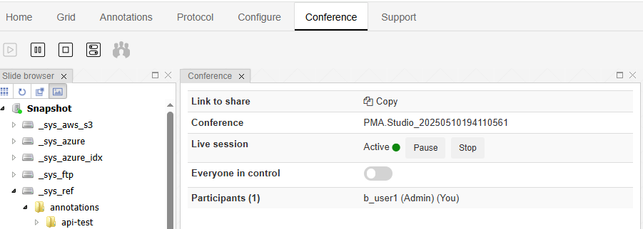 Host or participate in virtual conferences that include joint and simultaneous exploring slides or grid of slides and annotating slides. Conferences can be secured with a password and allow for bi-directional synchronization.
