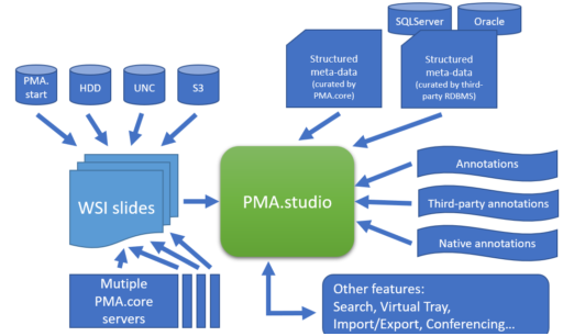 Whether you’re looking to annotate slides, integrate distributed heterogeneous databases with your slides, or are looking to host collaborative long-distance tele-conferences, Pathomation’s PMA.studio is a true cockpit for the pathologist and (imaging) research scientist alike.