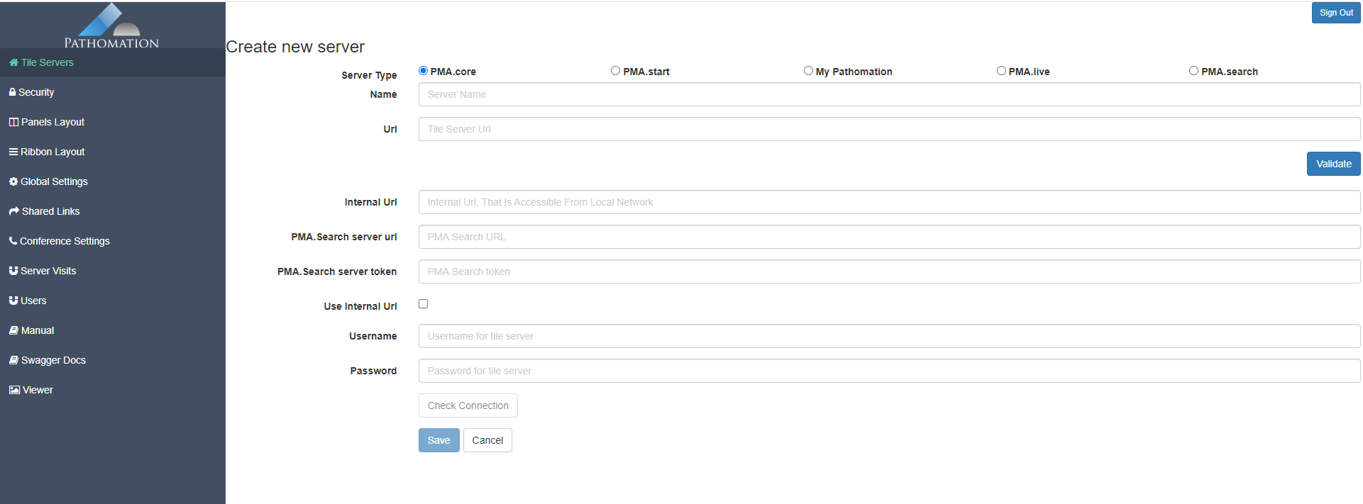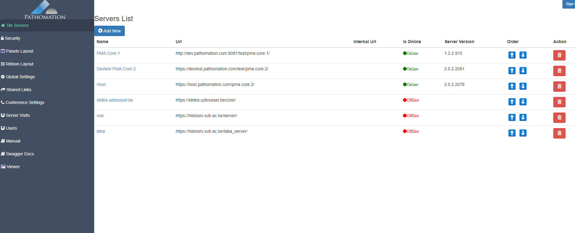 This page allows you to add different types of servers used by PMA.Studio including PMA.core, PMA.search, PMA.start, My Pathomation and PMA.live. You can press “Add New” button to add a new server.