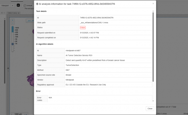 Once user selected AI algorithm from the menu he is shown a pop box with details about algorithm, selected ROI, whole slide and also cost associated with performing the analysis. Its important in case of ROI that dimensions of it are with in selected AI algorithm boundaries else it would not allow to perform analysis. Once criteria is met “Run AI Analysis” button is enabled to perform analysis.