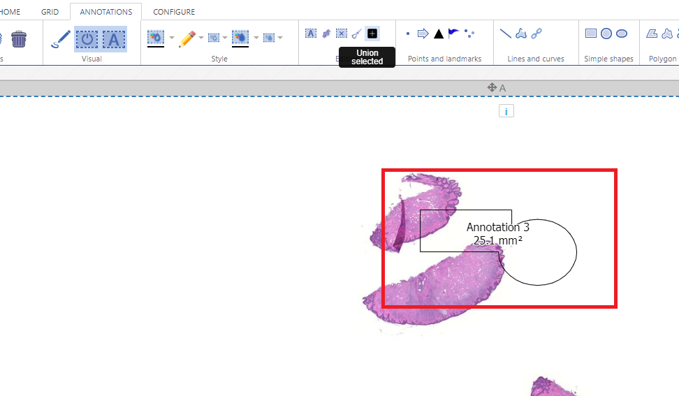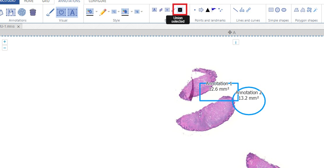 The “Union” button allows user to union two polygon geometries. To union annotations, you first select the two annotations using the shift key and press the “union selected” button, and both annotations will be united.