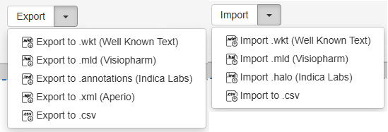 PIMS LS allows you to import and export annotations in a variety of formats, including Well-known text (the format used by PMA.core internally), Visiopharm mld files, Indica Labs HALO annotations files, Definiens/Aperio xml files, and ‘plain’ csv files.