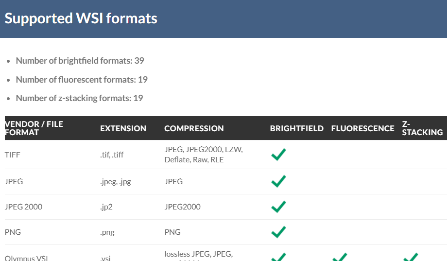 The list may slightly differ from the actual file formats that you can read, in case you are not using the latest PMA.core tile server version.