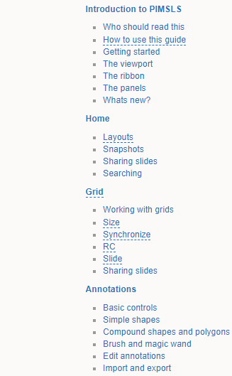 This guide is organized in different sections in the sidebar and follows the way PIMS LS is organized so you can easily find information about the function you're trying to use.