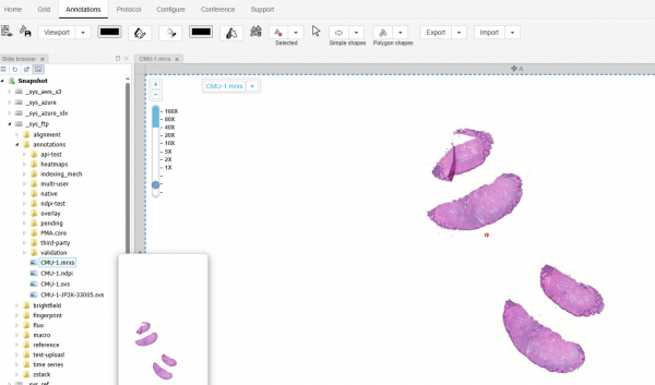 Purpose of Navigation panel is to provide an access to connected Tile servers, represent folder\slides structure and select slide to inspect. Navigation panel works in 2 modes - Tree mode and Slides mode.