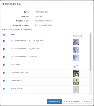 The Tray panel is a virtual store of slides, user can send slides to the Tray and keep them in Tray for the current session. User can open select slides from tray and open them in viewer tabs or in a grid or remove them from the Tray.