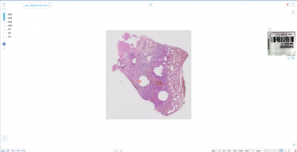 Associated images are images that are part of the whole slide image data package, and provide additional information about the slide. Examples include a thumbnail image, a scan map, barcode image, or a label image. The first and the latter of this list are automatically added to the right of the viewport, if they are available.