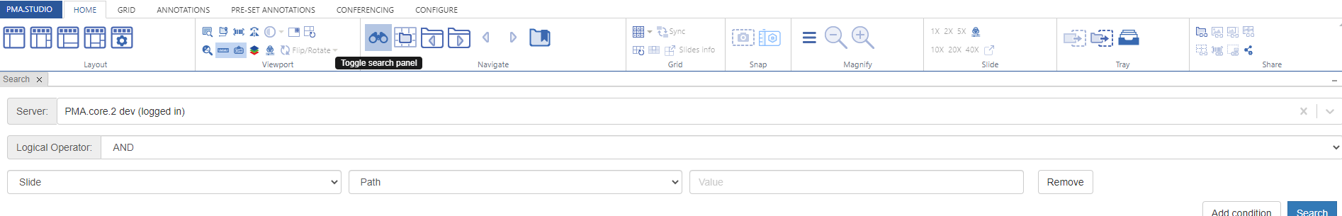 To conduct a search; user needs to select the PMA.core server from the dropdown list, by default the logged in PMA.core server is selected. Then by default “AND” logical operator is selected and user can change it to “OR” as per the logical condition to be applied on the selected parameters. Then we have the list of forms and respective form fields user can choose from. By default a hardcoded form value “Slide” is selected with two fields “path” and “barcode” which allows you to search slides through path and barcodes. User can select the form and respective fields as per their search criteria. You can add multiple conditions using the “Add Condition” button.