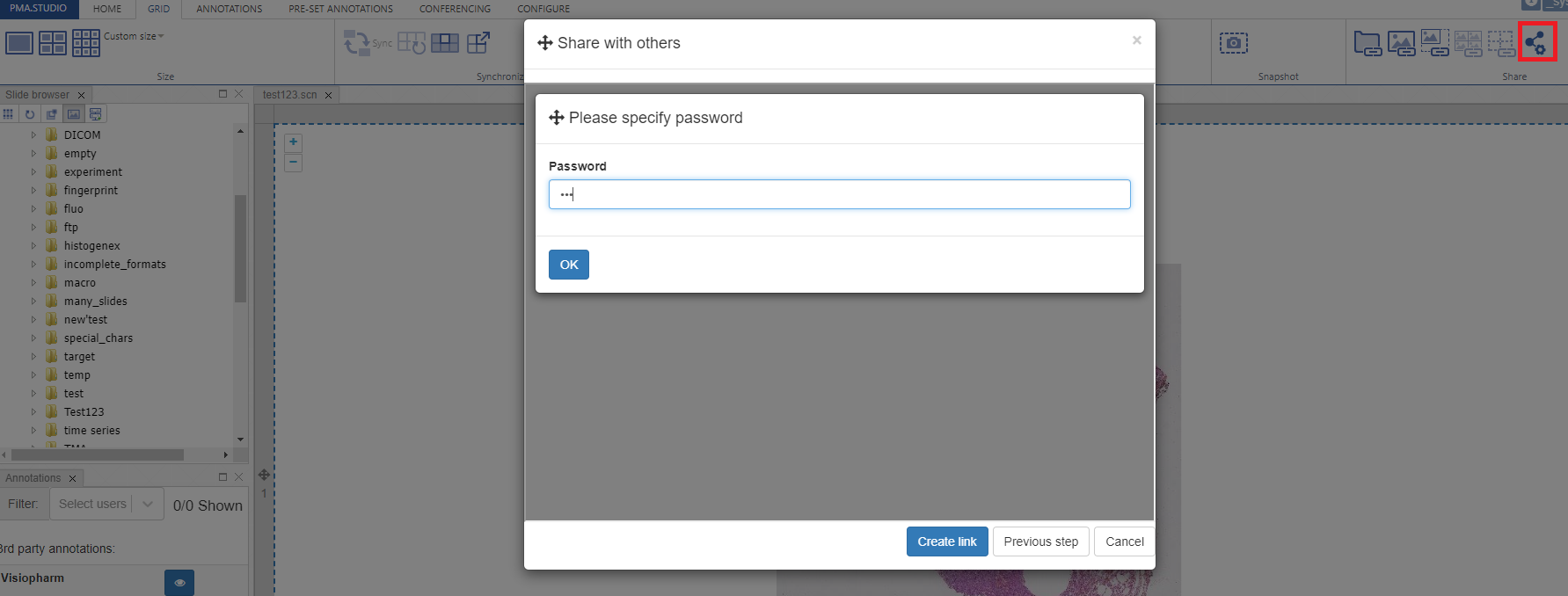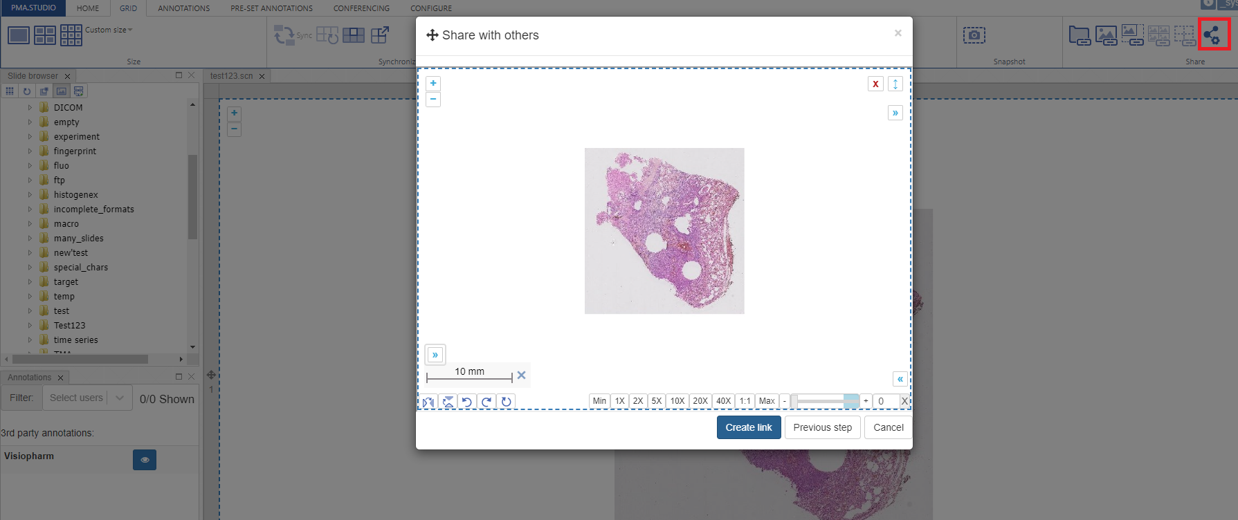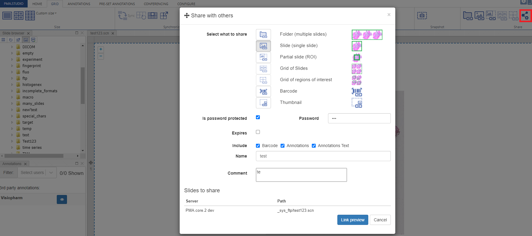 Sharing content is arguably one of the most important applications of digital pathology, if not for the Web in general. PMA.studio allows you to share content in a variety of ways. There is a dedicated group for sharing content on the ribbon: