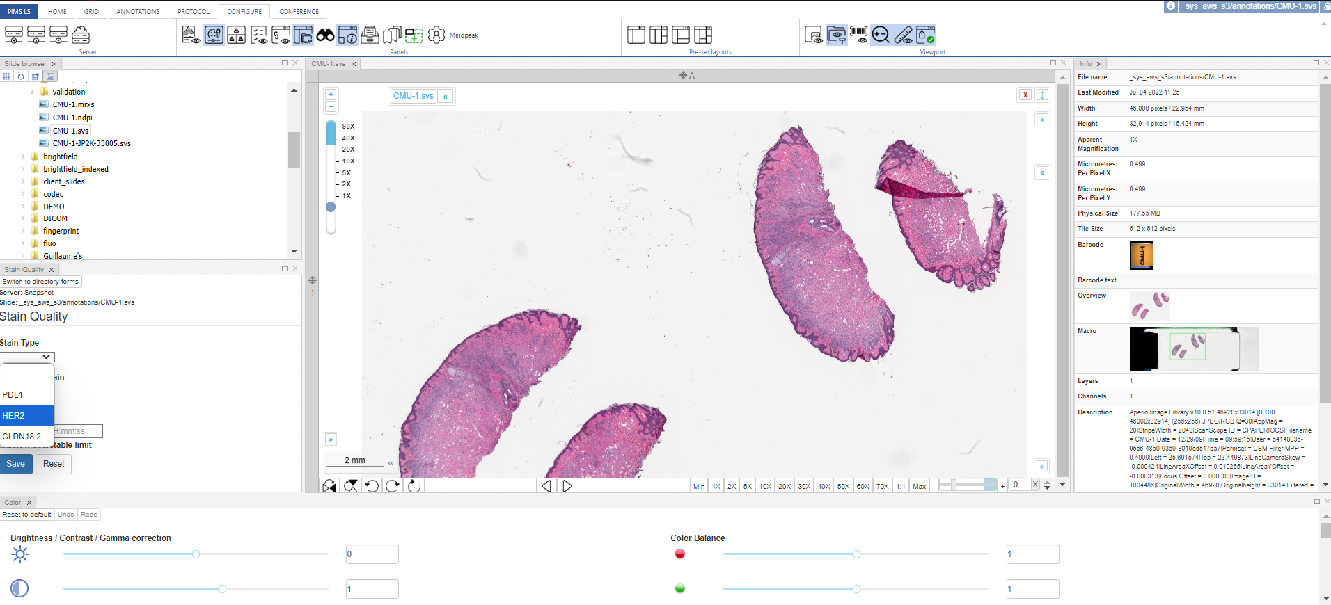 In the example below you can see the concept of the pathologist cockpit come to life, with the slide browser, a custom form for data collection, colour adjustments, and slide metadata all visible at once.
