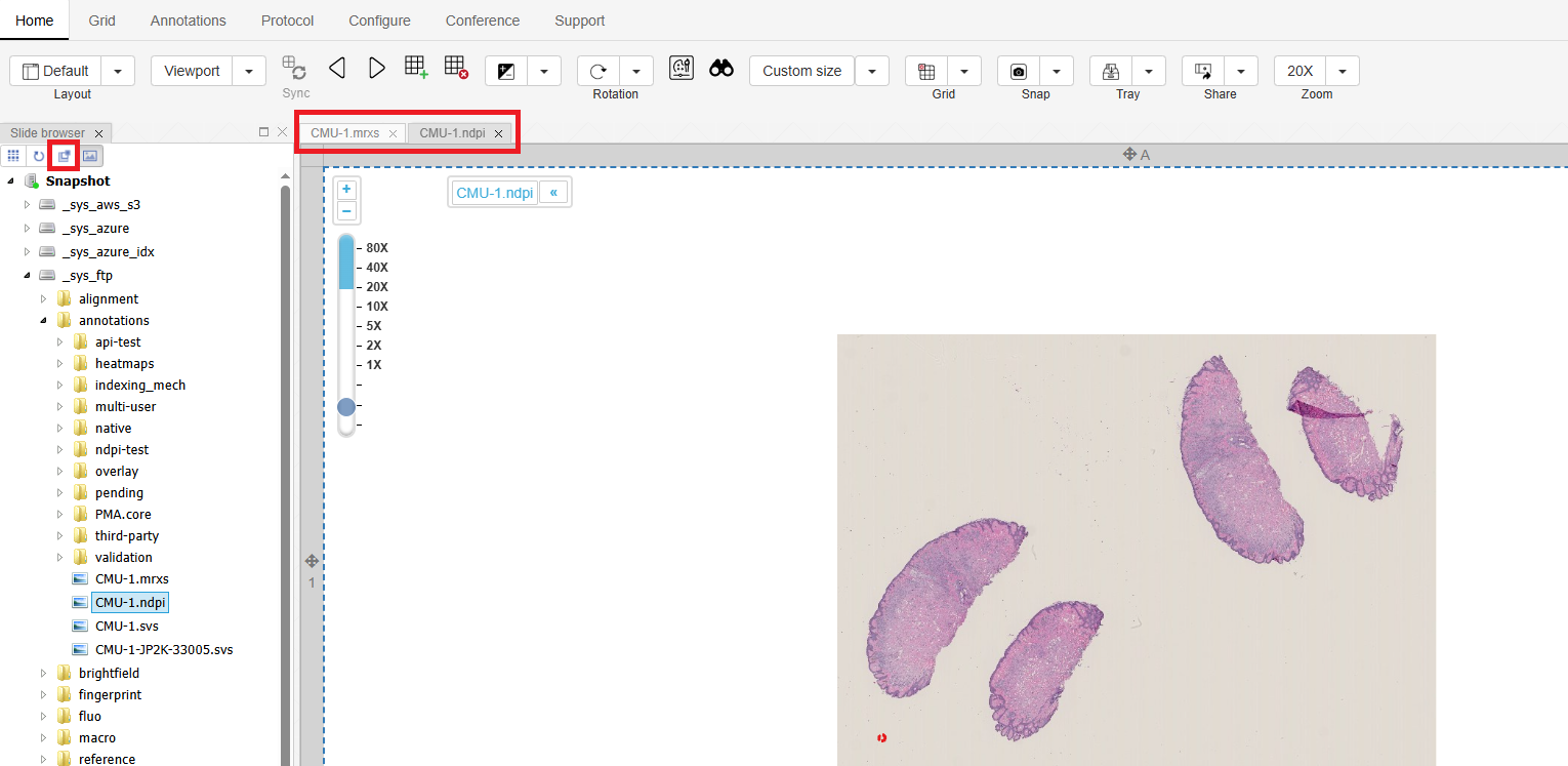 Purpose of Navigation panel is to provide an access to connected Tile servers, represent folder\slides structure and select slide to inspect. Navigation panel works in 2 modes - Tree mode and Slides mode.
