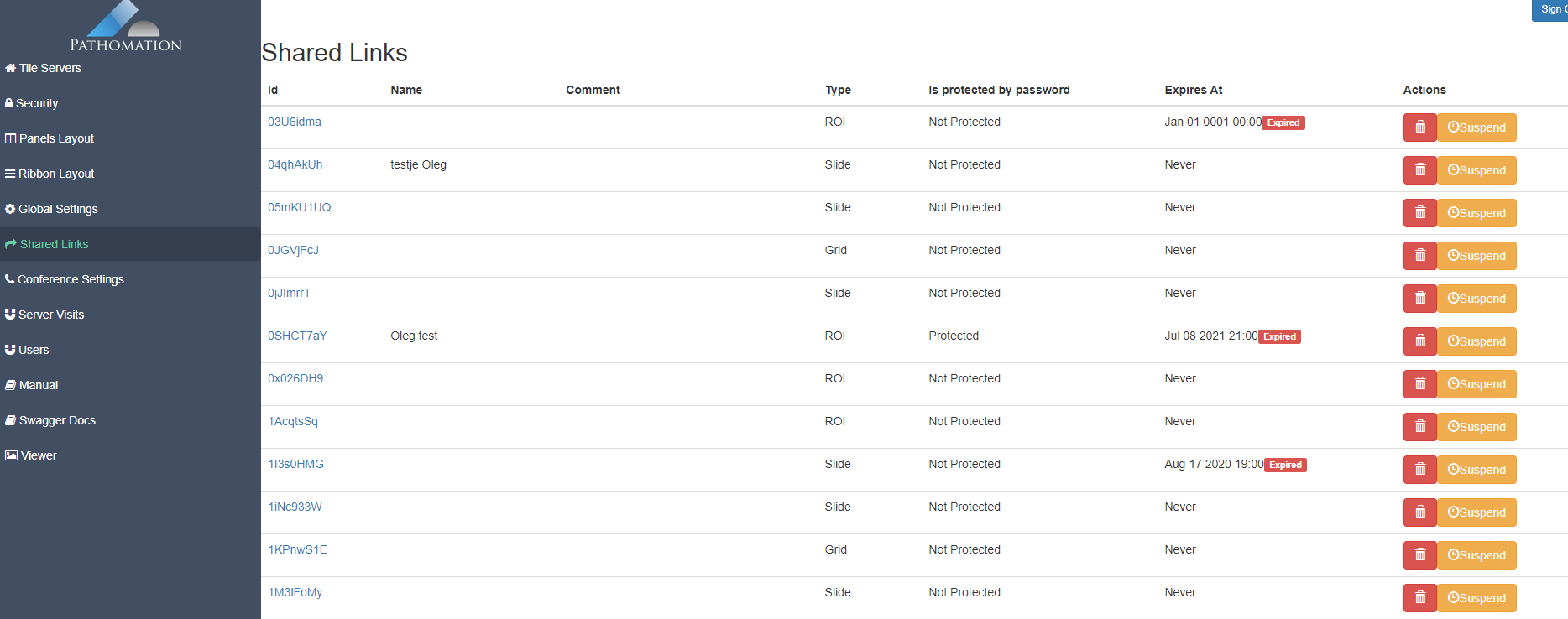 This page list down all the shared links created for a slide or slide folder. It provides detail about each of the shared links that include link type, is password protected and expiry date. You can also delete or suspend a shared link.