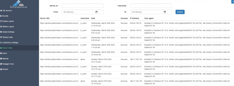 This page list down all the different visits to PMA.Studio. Records can be filtered through PMA.core server url, username and date of visit. Each row consists of:
