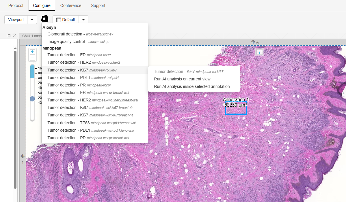 Once user selected AI algorithm from the menu he is shown a pop box with details about algorithm, selected ROI, whole slide and also cost associated with performing the analysis. Its important in case of ROI that dimensions of it are with in selected AI algorithm boundaries else it would not allow to perform analysis. Once criteria is met “Run AI Analysis” button is enabled to perform analysis.