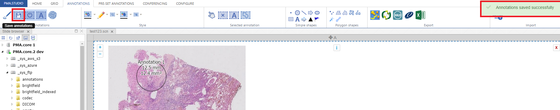 Next is “Save Annotations” button that allows you to save annotation to the PMA.core server. Once you click on it you will get a notification if annotation was successfully save or not.