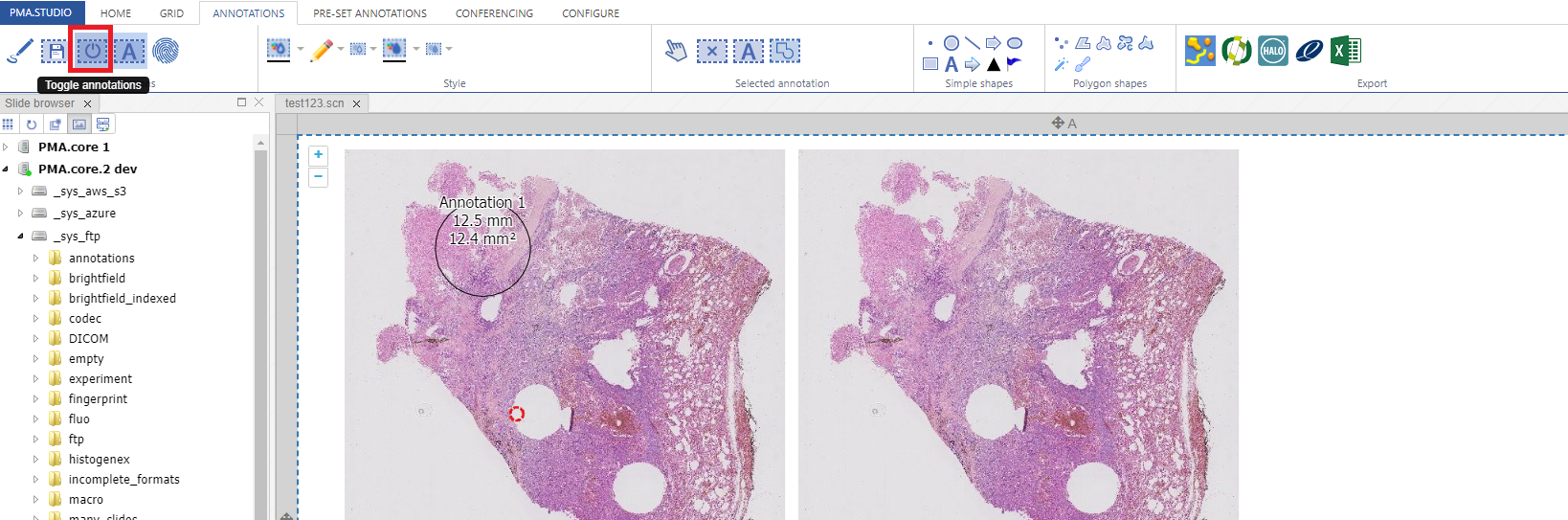 The very first button in the annotation panel is “Toggle Annotation Panel” which adds the annotation panel to the viewport. The panel shows details about all the annotations you added to a particular slide with different stats as well.