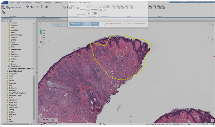 Once you've completed drawing your annotation, you will be prompted to confirm the annotation, and give it a description or classification e.g. carcinoma