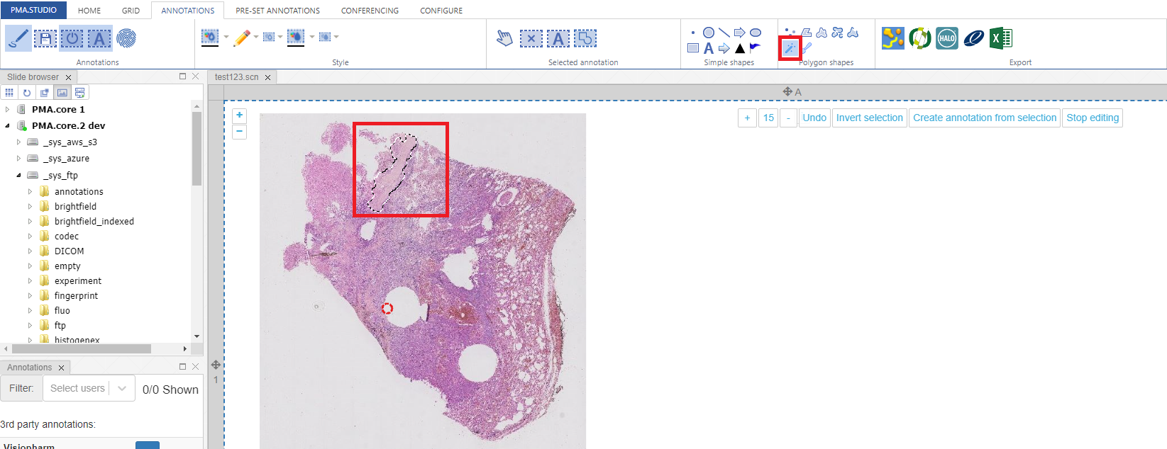 Wand tool allows you to select different areas on a slide by simply clicking on the slide. Once you click on a slide that specific area is automatically selected and annotation can be created on that area by clicking “create annotation from selection” button.