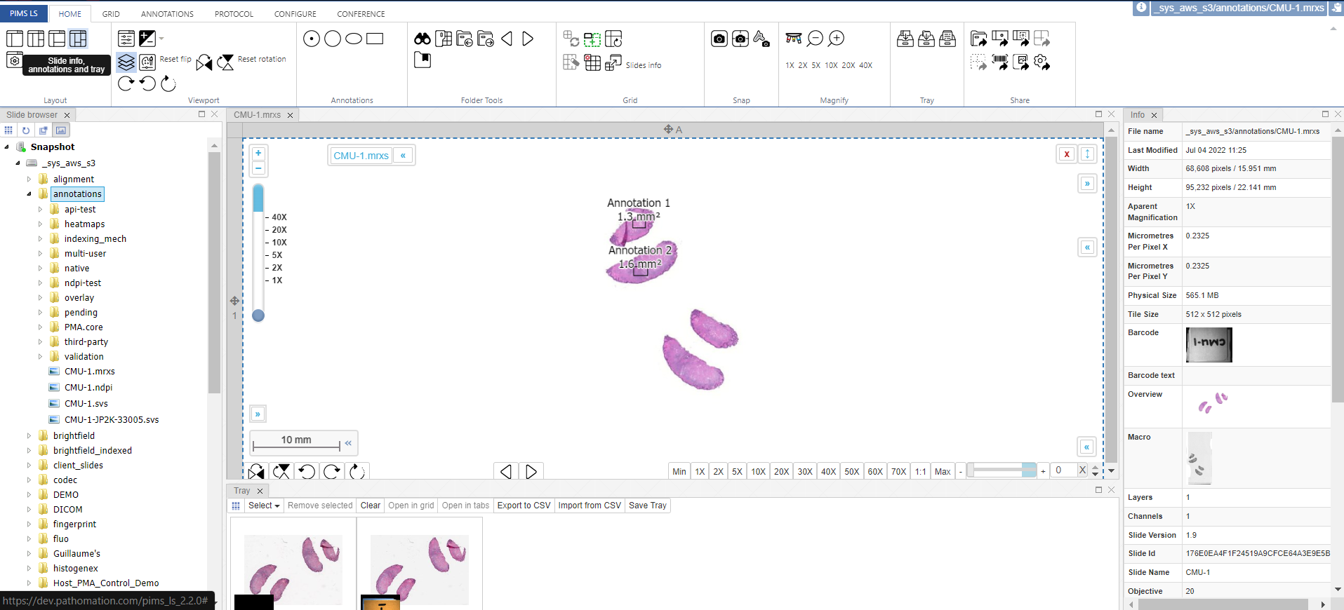 Opens three panels - the file browser, the tray panel, and the slide info panel: