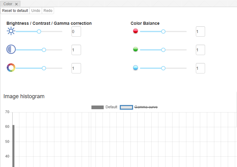 Slider and input are synchronized and user can adjust settings using both ways. 'Reset to default' button will reset settings to the following values - Brightness: 0, Contrast: 1, Gamma: 1.