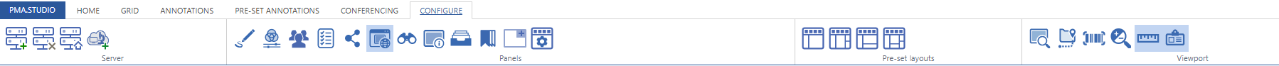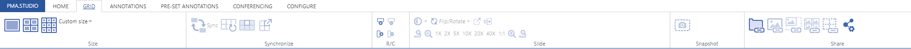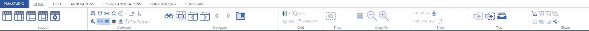 PMA.studio ribbon consists of number of tabs that hold set of controls to perform different actions on selected slides.