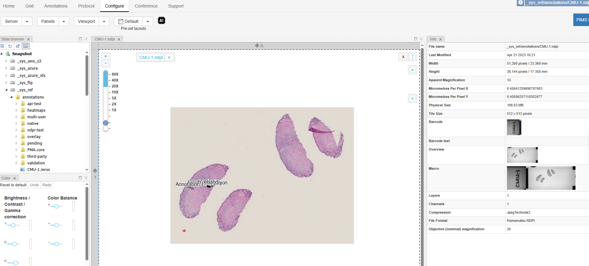 In the example below you can see the concept of the pathologist cockpit come to life, with the slide browser, a custom form for data collection, colour adjustments, and slide metadata all visible at once.