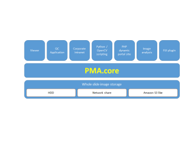 PMA.core manages your whole slide images. It is not responsible for viewing and other operations such as annotations, data capture, and image analysis. While PMA.core contains the necessary functions to retain these types of data, it does not provide end-user interfaces to create and manipulate it. The software acts as a broker between the various vendor-dependent file formats on one end, and a variety of different end-user applications on the other: The end-user applications are typically referred to as “downstream” applications in this manual. They can be other member-components of our platform (PMA.view is an excellent viewer), but they may be completely custom-built by third-parties as well (in which case communication with PMA.core is conveniently facilitated through webservices). This type of broker-like interaction enables both downstream viewing and analysis. PMA.core allows adopters of WSI to build a context around each slide (on-slide graphical annotations and form-data) and manage this as needed.