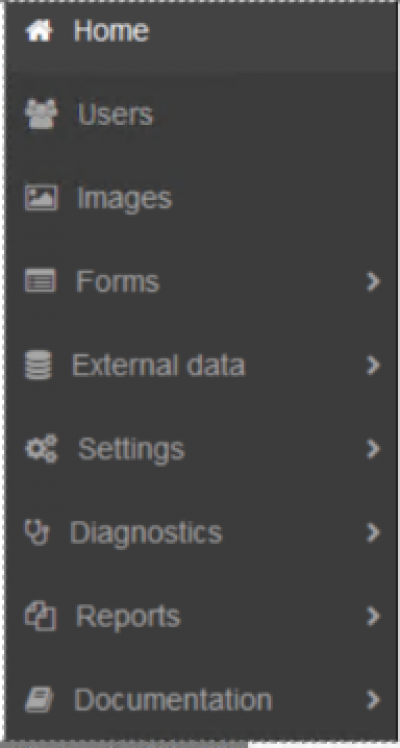 - Content frame: shows content for the selected menu-option. By default, the “home” selector in the menu is highlighted upon login. Some high-level usage statistics are shown in this, which can be further examined by clicking on them.