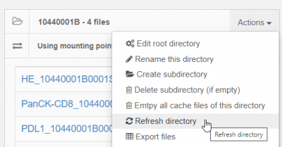 This option is useful during setup of new root-directories. For large volumes of data, working via an external file manager or upload tool like PMA.transfer is more convenient than uploading slides one by one using PMA.core's own built-in upload tool.
