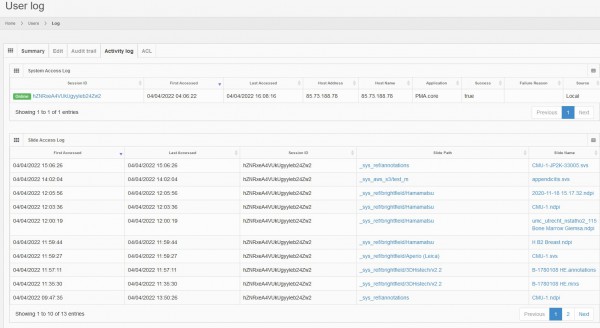 Clicking on the Audit Trail tab of a user will display a chronological list of all changes performed to a user, as well as all changes performed to the access list of that user (see access control lists)