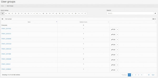 In the main list page you can see a paginated list of all groups defined in the system. Each row (except the everyone group) has the following options for the corresponding group:
