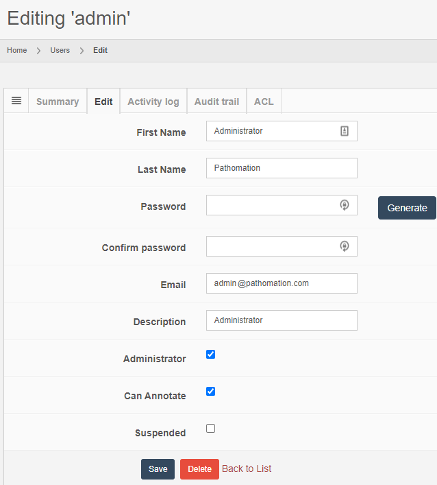 Ein Pathomation-Vertreter kann Ihnen die ersten Anmeldedaten für den ersten Besuch der URL geben.