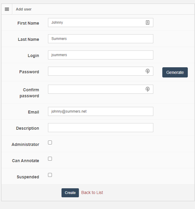 Beim Anlegen oder Bearbeiten eines Benutzers können Sie festlegen, dass PMA.core ein Passwort für Sie generiert. In einem solchen Fall generiert PMA.core das Passwort, das dem Benutzer zugewiesen wird, und zeigt es an. Sie sollten es sich an dieser Stelle notieren. Alle Felder unterhalb des Feldes “E-Mail” können Sie wieder ignorieren. Klicken Sie auf die Schaltfläche “Erstellen”, um das neue Benutzerprofil fertigzustellen und es in der Benutzerliste erscheinen zu lassen: