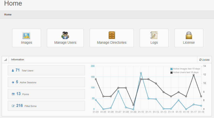 - Inhaltsrahmen: zeigt den Inhalt der ausgewählten Menüoption an. Standardmäßig ist der Menüpunkt “Home” bei der Anmeldung hervorgehoben. Hier werden einige hochrangige Nutzungsstatistiken angezeigt, die durch Anklicken weiter untersucht werden können.