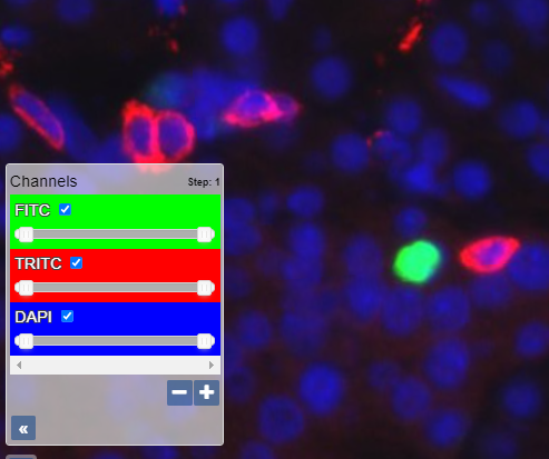 Lorsque votre diapositive contient un ou plusieurs canaux de couleur fluorescente, un widget séparé apparaît dans le côté gauche de la fenêtre d'affichage pour permettre des contrôles à cet endroit.