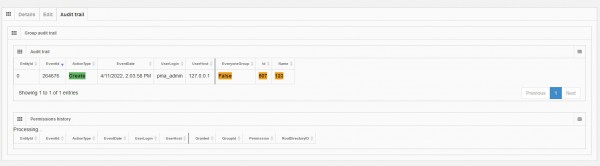 Clicking on the Audit Trail tab of a Group will display a chronological list of all changes performed to the Group, as well as all changes performed to the permissions of that Group