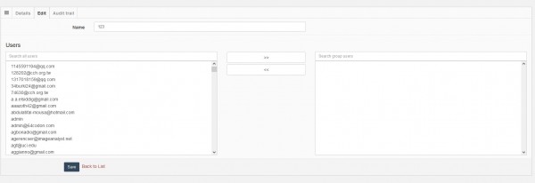 After creating a new Group or by clicking on the Edit button on the list page you can modify a Group. In this page you can add and remove users to this Group. You can also modify the Group name.