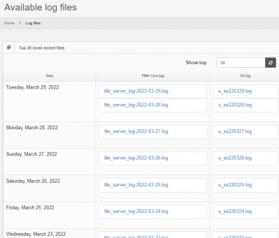 The log file section provides access to the raw log files produced by the server.